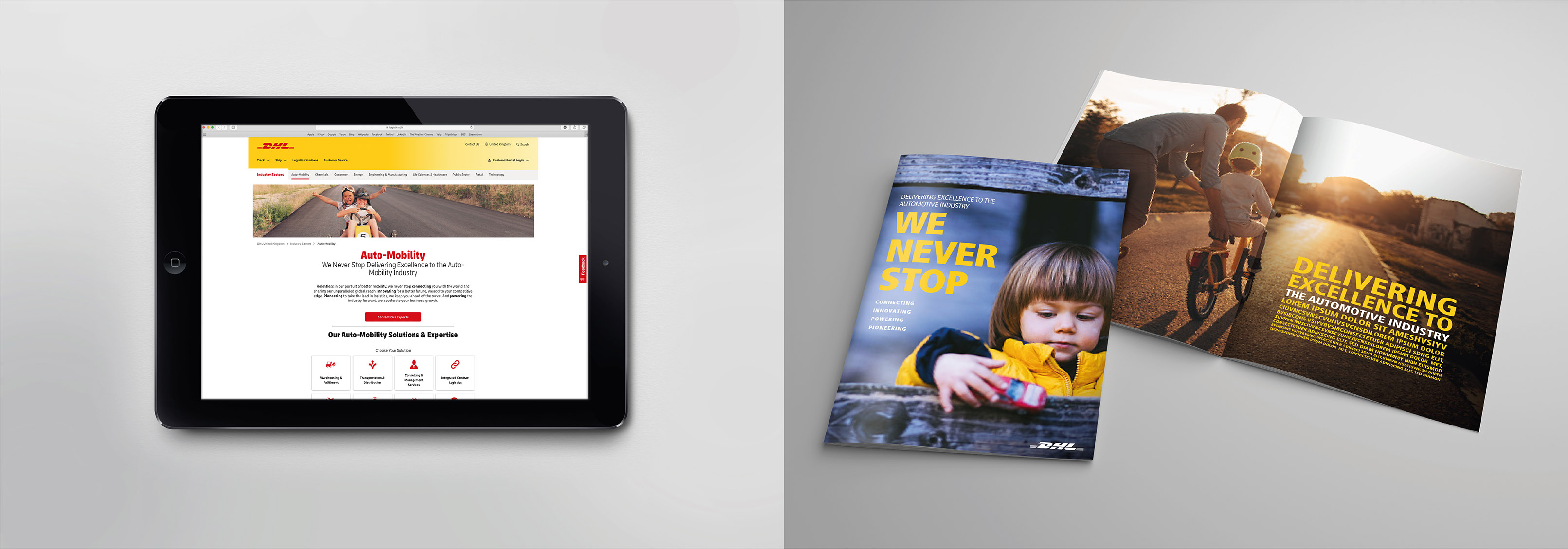 We work with DHL, the world’s leading logistic company offering strategic insight, brand development, communication planning and big integrated ideas. We work across a number of their B2B sectors including Aviation & Aerospace, Life Sciences, Auto-Mobility, Innovation and eRetail & Fashion for the team at DHL who spearhead the relationships of their largest and most important global clients. We define key messaging and create sector identities, which are brought to life in digital, print and experiential disciplines.